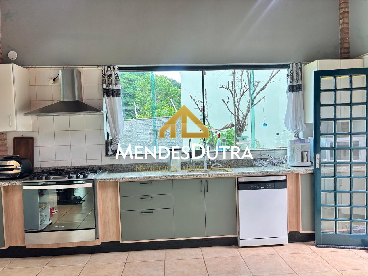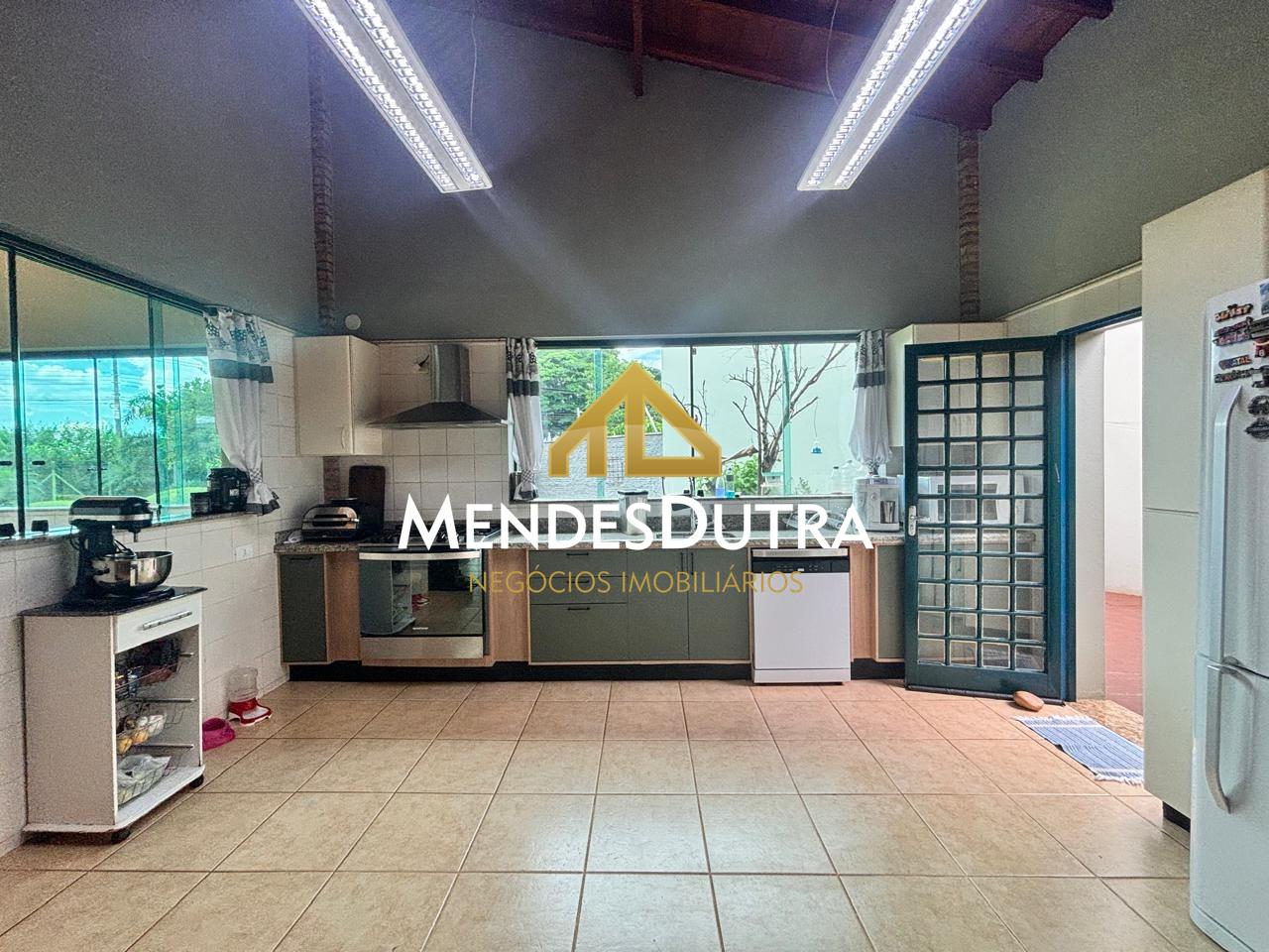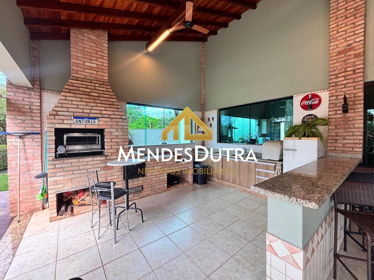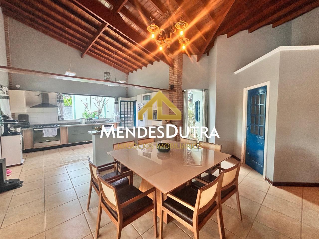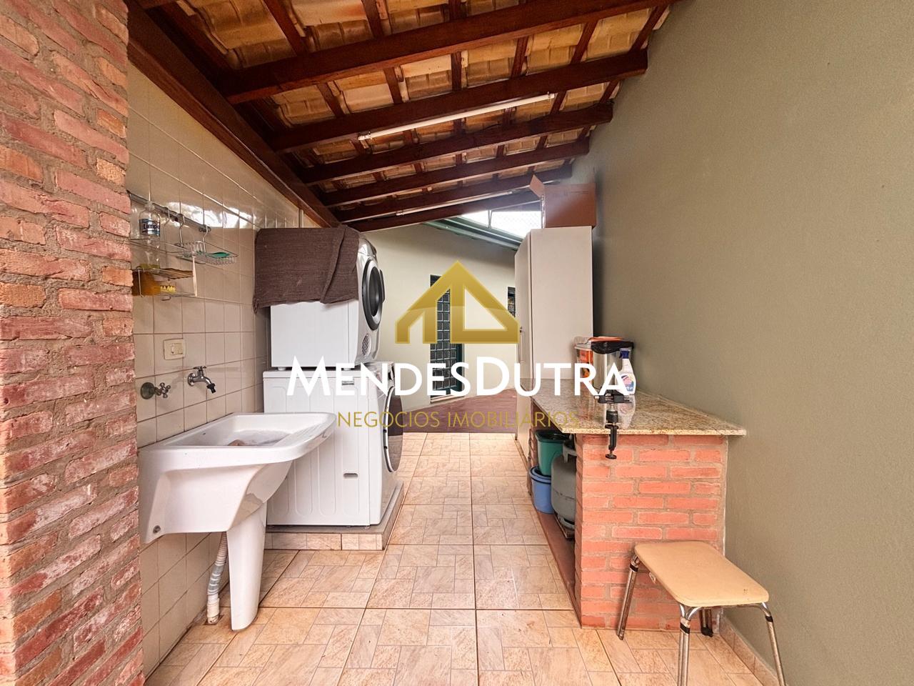 A casa possui ampla varanda com espaço gourmet, churrasqueira, forno de pizza, forno à lenha, 2 banheiros externos, sala ampla com pé direito duplo, teto em madeira, portas em blindex permitindo muita iluminação natural, cozinha espaçosa integrada à sala com armários, banheiro social, 2 quartos com armários, área de serviço, 1 quarto externo.